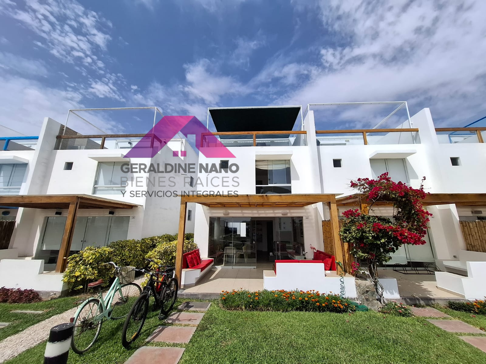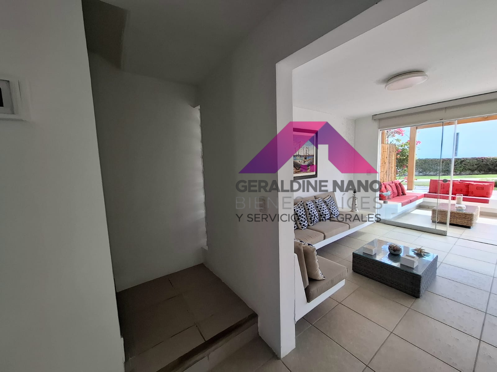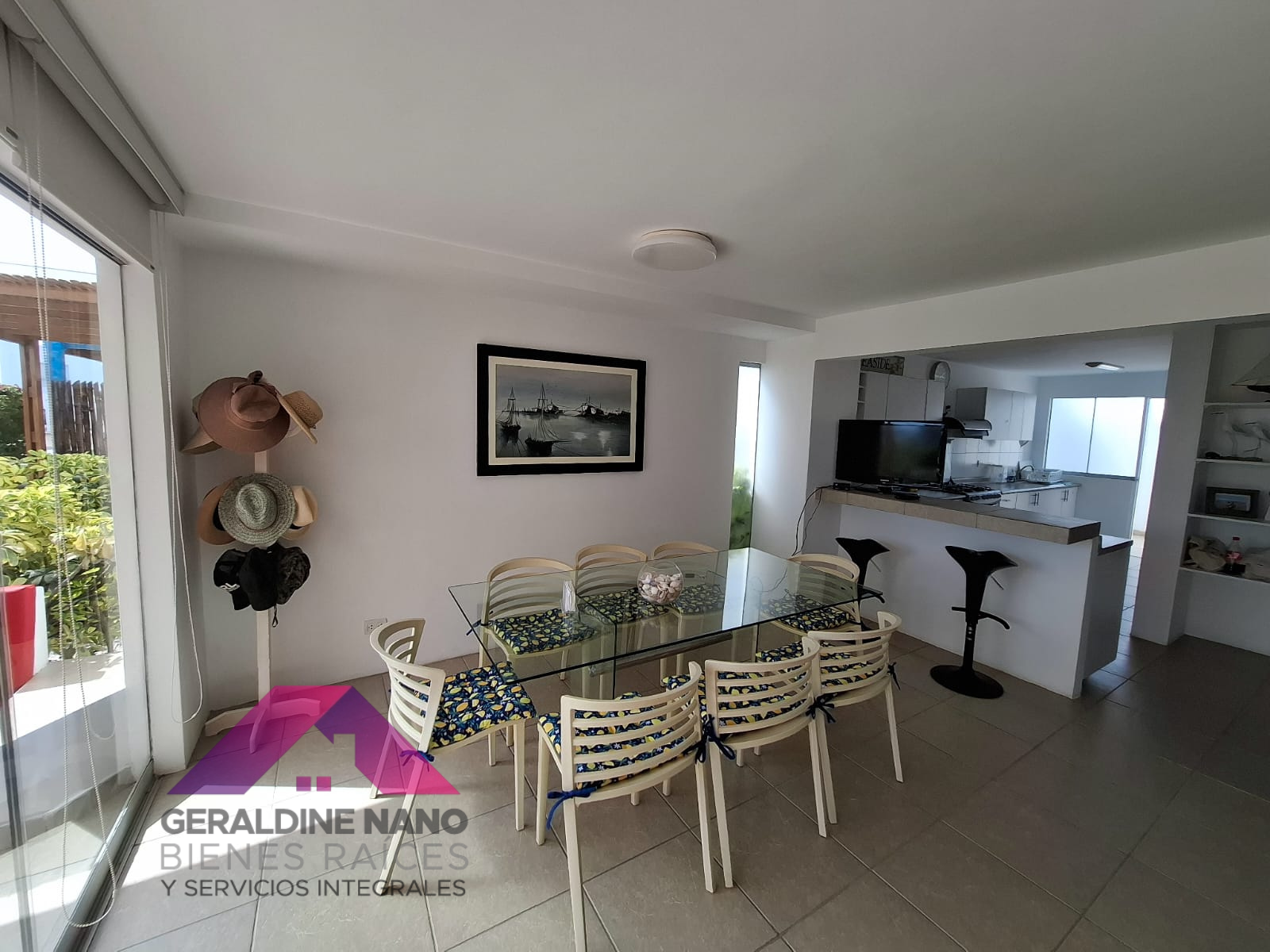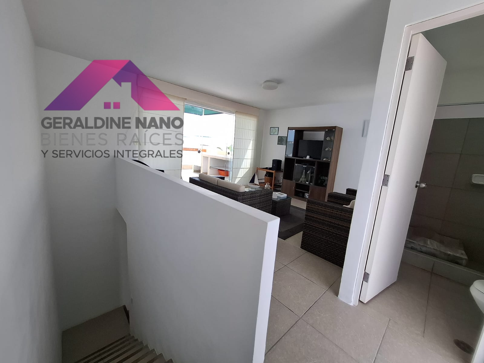 1er. Piso: Terraza con mampostería y cojinería, mesa de centro, Techo sol y sombra con policarbonato, sala con mampostería y cojinería, mesa de centro. TV Smart, Comedor de vidrio con 8 sillas, cocina con reposteros altos y bajos, equipada con cocina, campana extractora, refrigeradora y otros, baño de visita, patio-lavandería con Therma a gas, muebles con puertas, puerta de servicio con salida a estacionamientos, cuarto de servicio con camarote y colchones de 1.5 plazas de madera, repisas y baño de servicio completo.