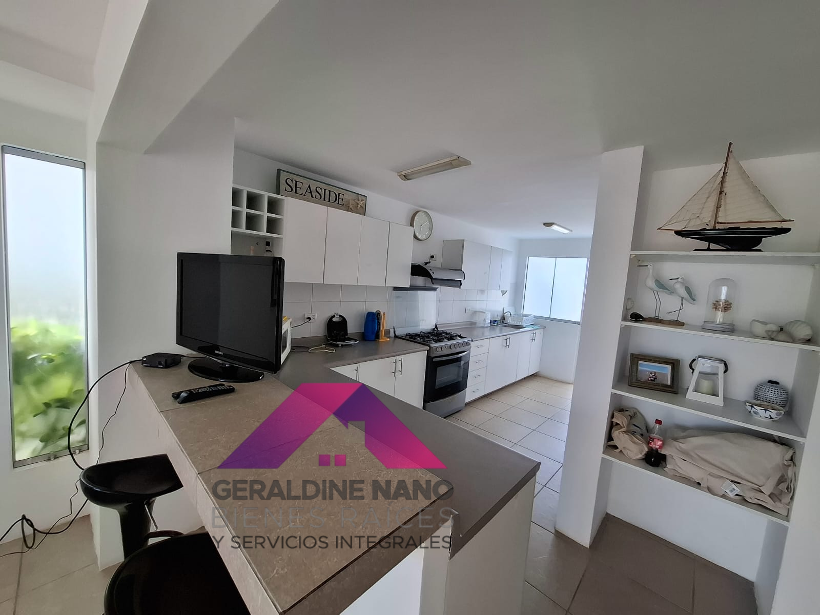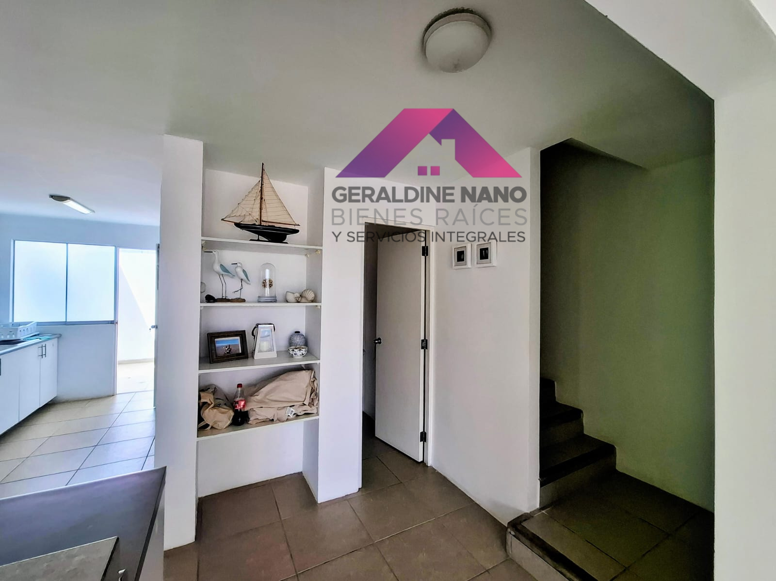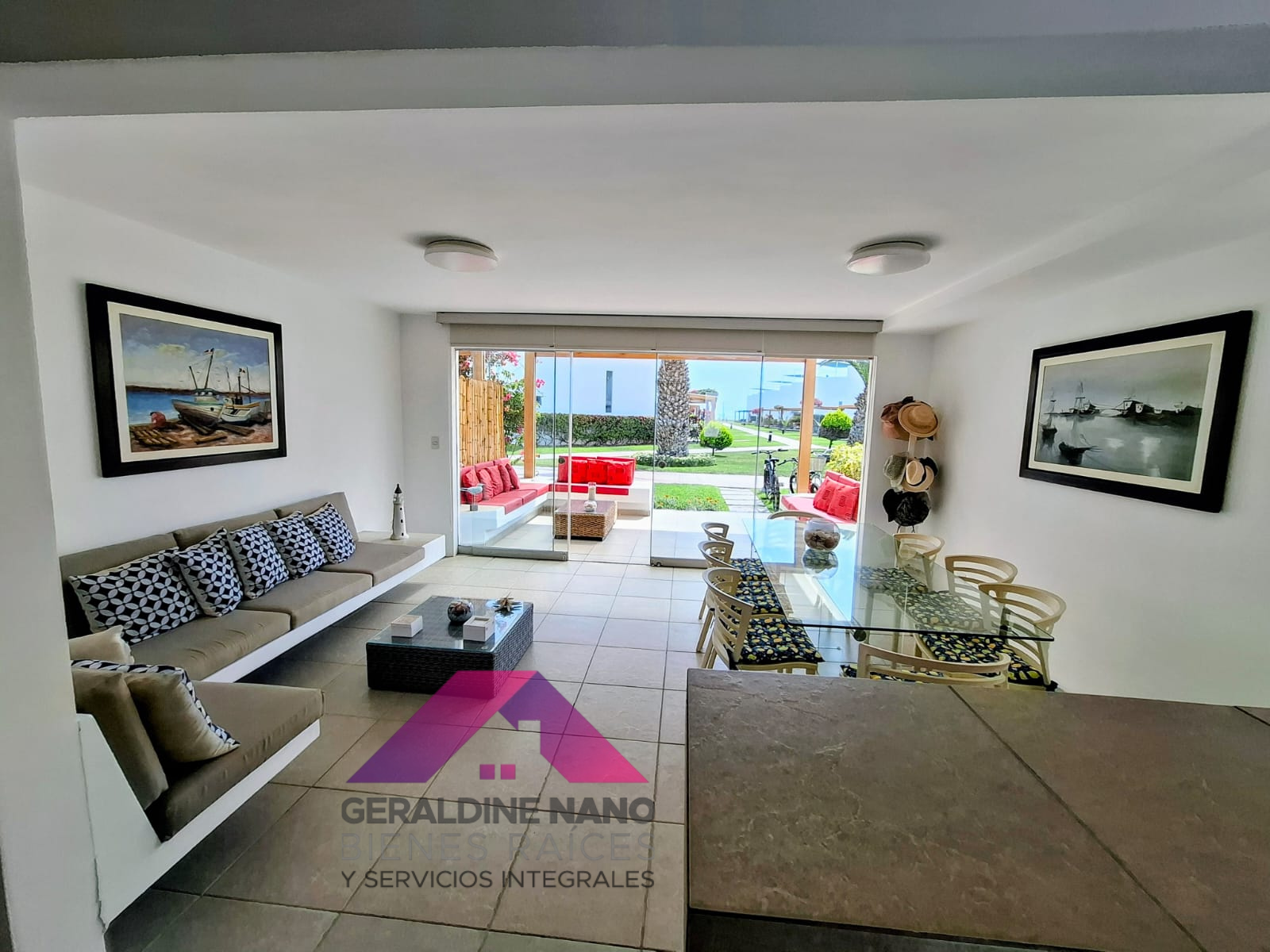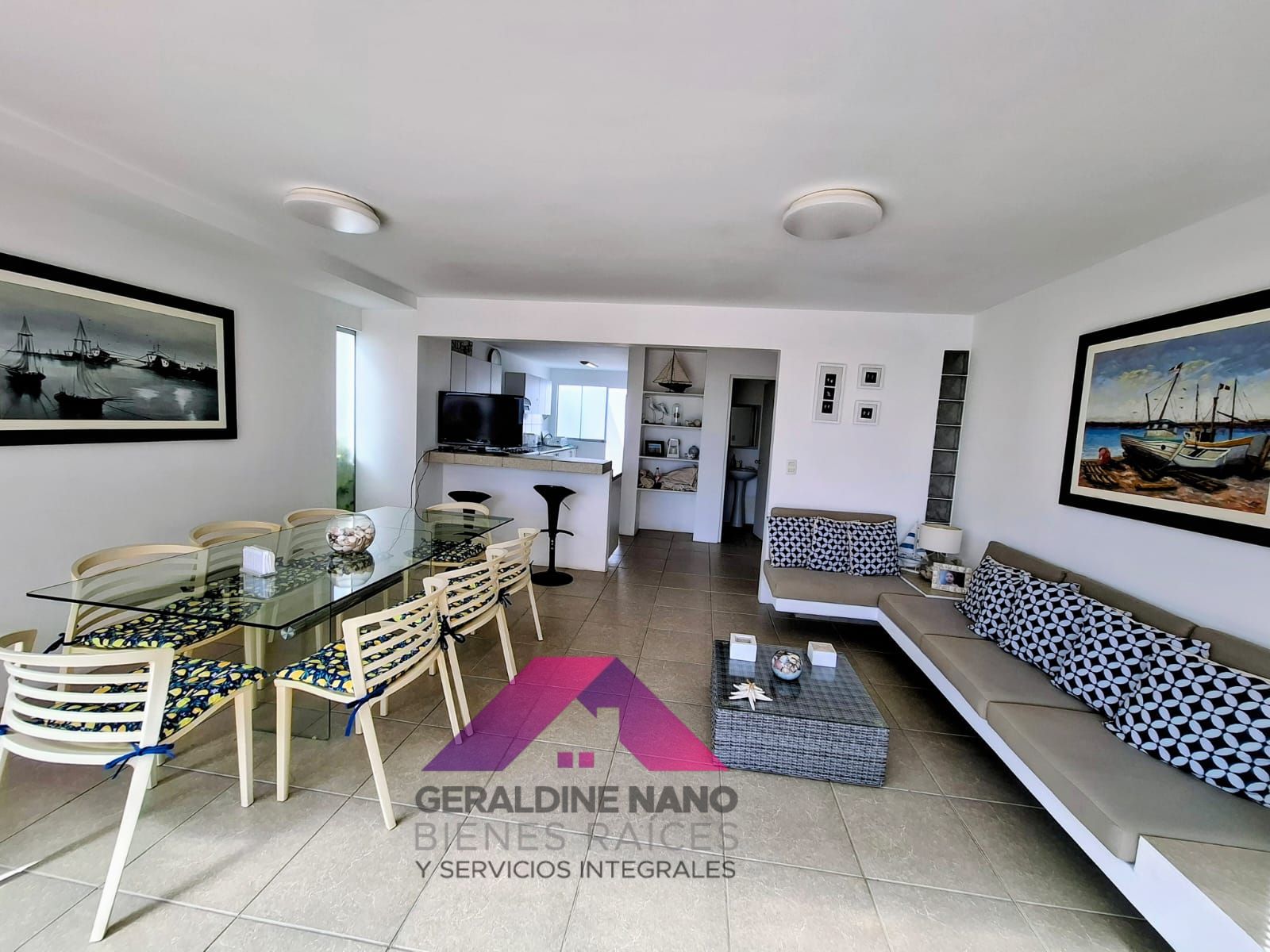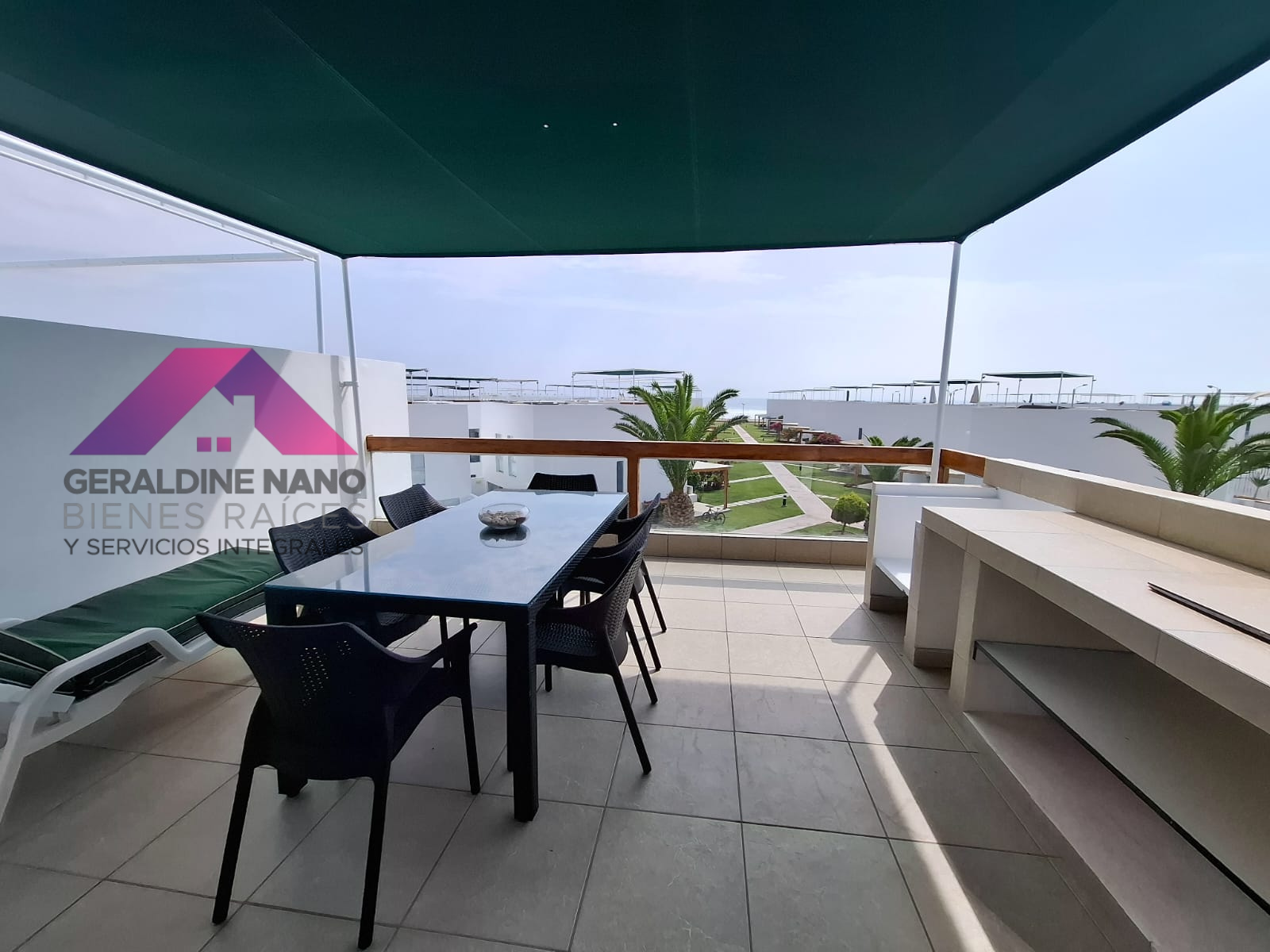 1er. Piso: Terraza con mampostería y cojinería, mesa de centro, Techo sol y sombra con policarbonato, sala con mampostería y cojinería, mesa de centro. TV Smart, Comedor de vidrio con 8 sillas, cocina con reposteros altos y bajos, equipada con cocina, campana extractora, refrigeradora y otros, baño de visita, patio-lavandería con Therma a gas, muebles con puertas, puerta de servicio con salida a estacionamientos, cuarto de servicio con camarote y colchones de 1.5 plazas de madera, repisas y baño de servicio completo.