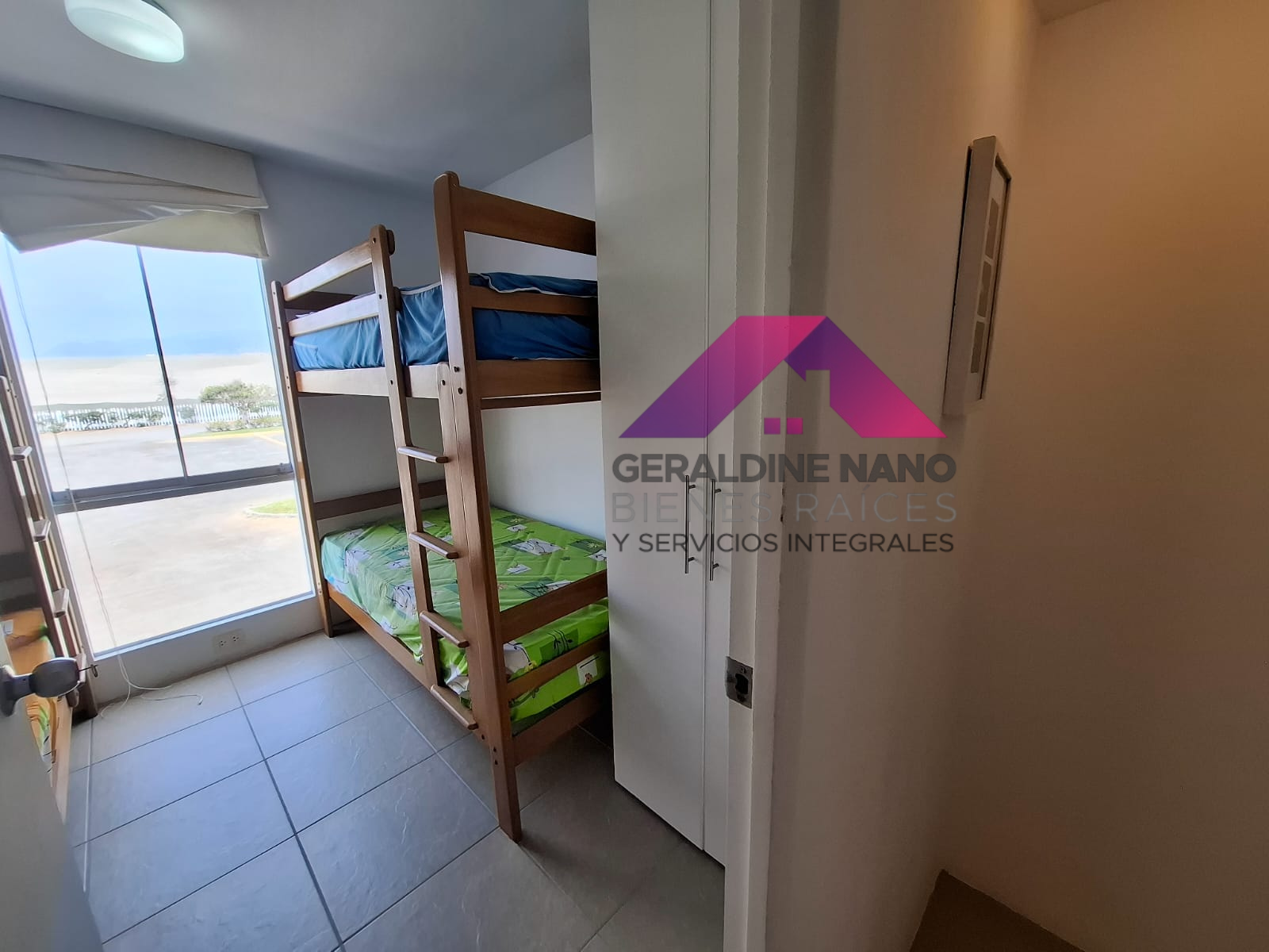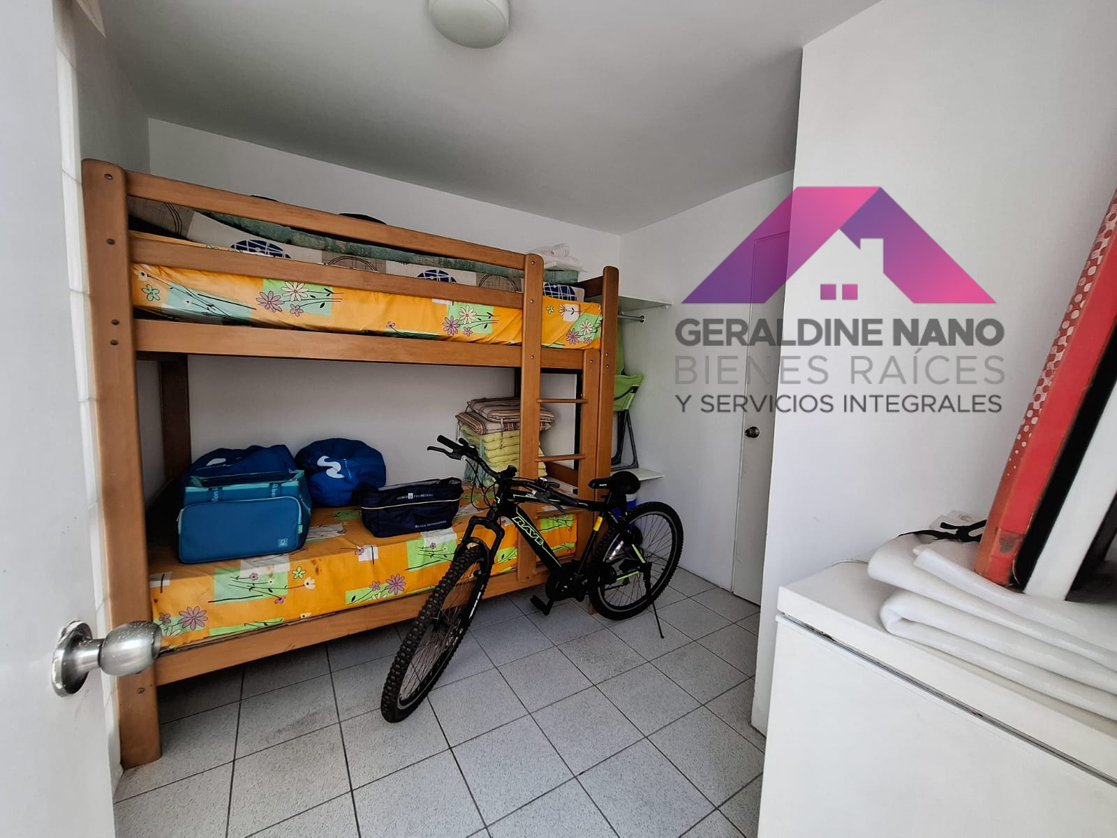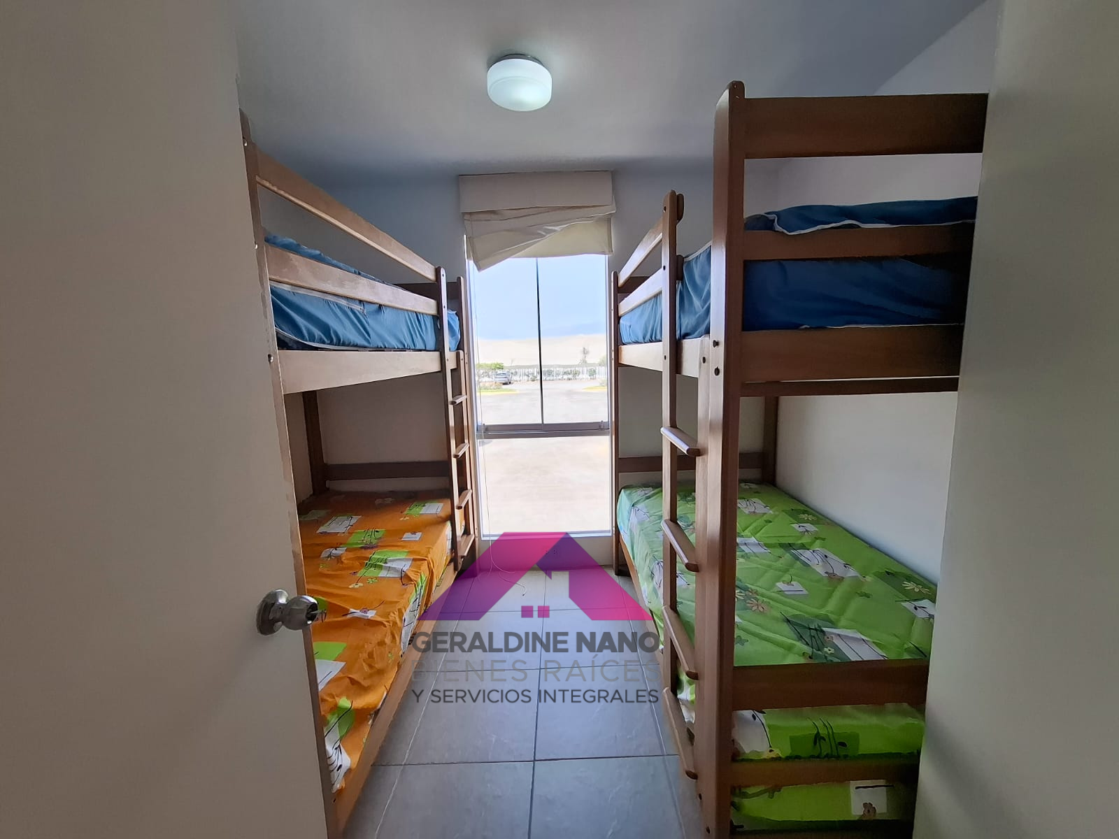 2do. Piso: 3 dormitorios: Dormitorio Principal con cama Queen, cabecera y veladores de madera, TV con mueble negro, Walkin closet y Baño completo incorporado, 2 dormitorios secundarios: Ambos con 2 camarotes de 1.5 plazas, mesa de noche, repisas, Baño Compartido completo.