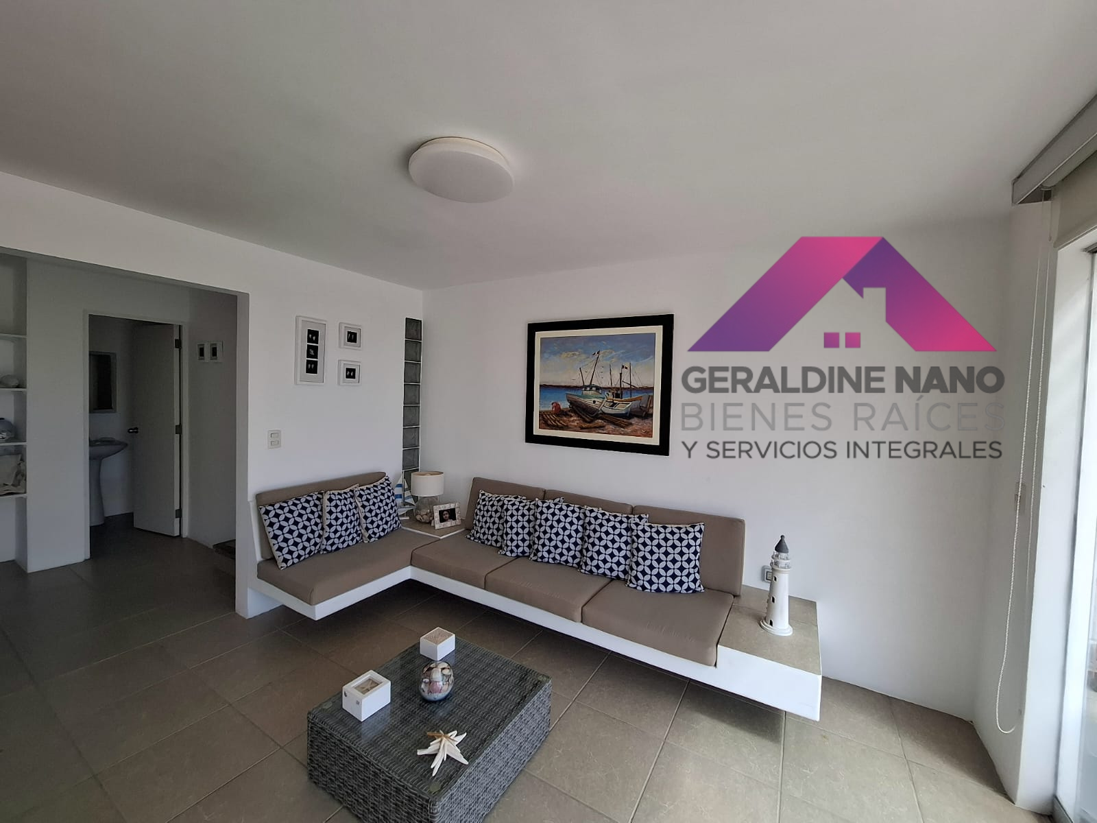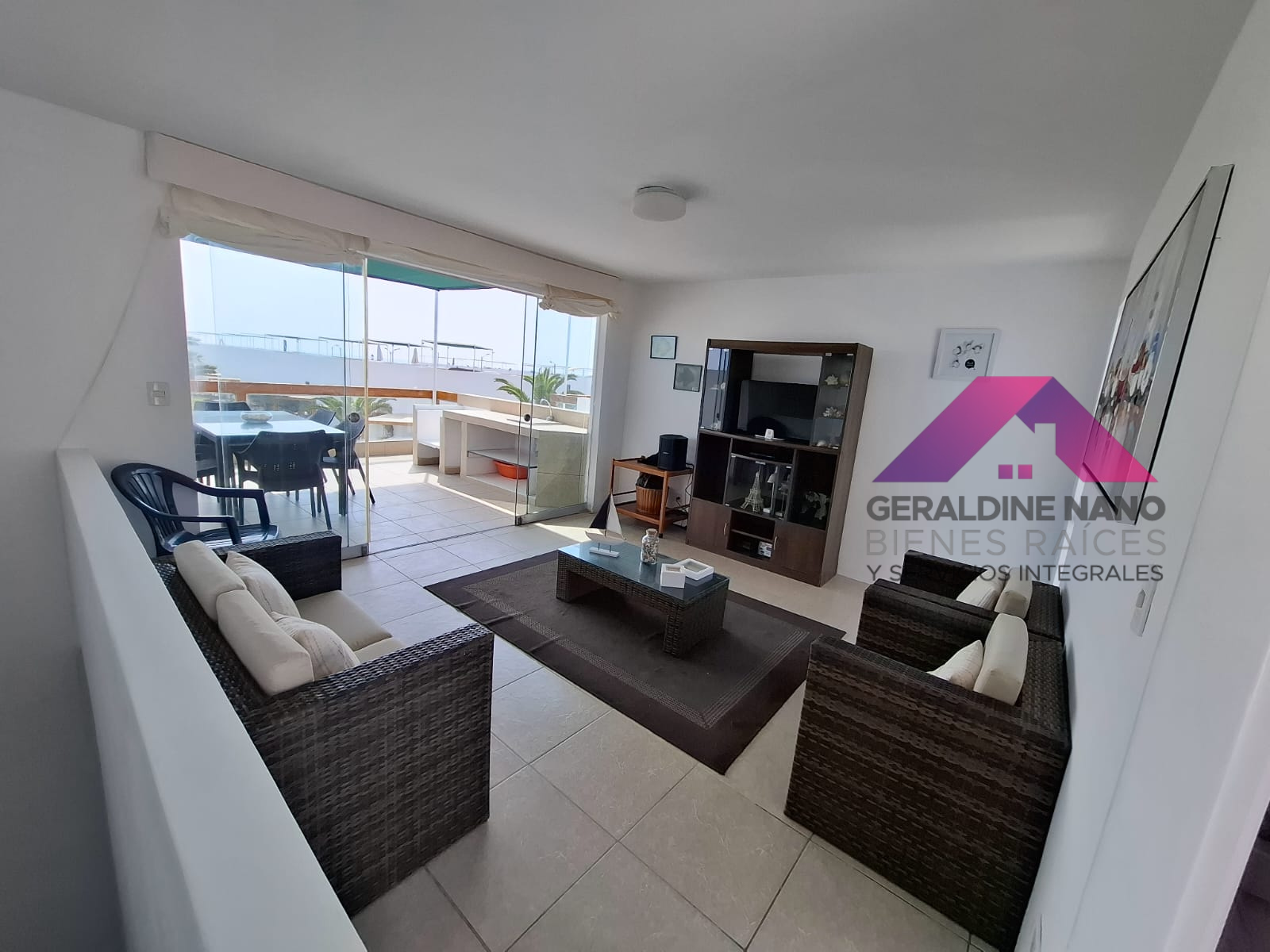 3er. Piso: Sala de Estar con juego de muebles de mimbre de 3 piezas, mesa de centro con alfombra, centro de entretenimiento con TV, en la Terraza tiene juego de comedor con 6 sillas, 1 poltrona, mesón de cerámicos con lavadero. Hermosa vista directa al mar. Cuenta con un baño completo y terraza posterior.